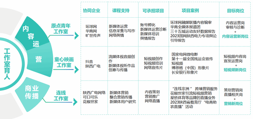 从2016年的‘新媒体训练营’孵化上百个自媒体账号,到2020年服务十四届全运会的‘华商全媒体报道团’,再到2022年参与环球网融媒体频道内容运维。2024年后,更是广泛与中粮集团、花椒世家、西安广电、雁塔人工智能创新发展中心等合作,拓展商业运营新媒体短视频板块和AI 赋能传播模式。学生们不断通过真实项目积累全媒体运营经验,师生团队在实践中锻炼了内容创作与运营管理能力,同时反哺课堂教育教学。”