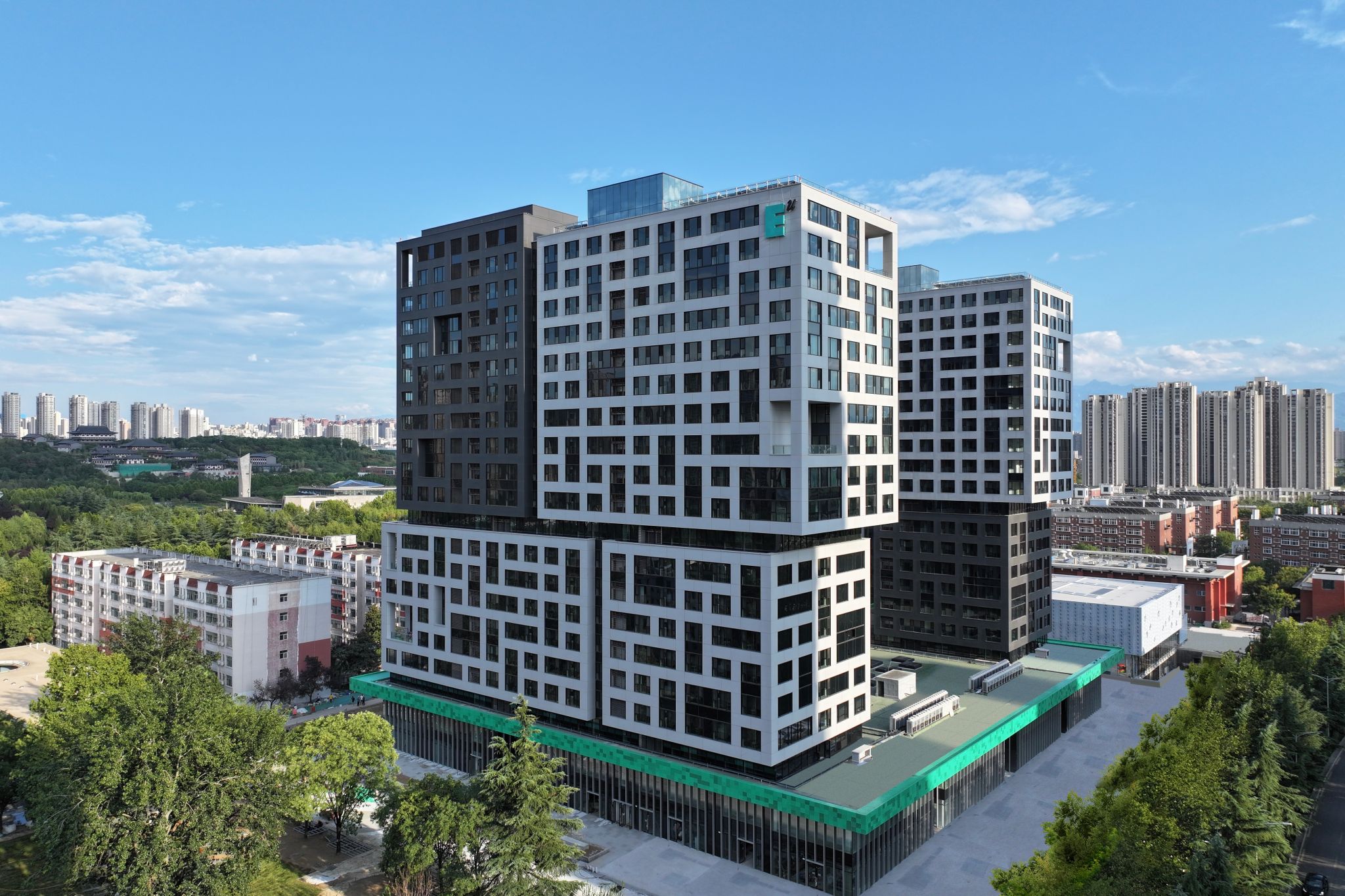 「春山里国际中心」总建筑面积80009.55平方米,建设历时4余年,地上建筑群由两栋20层学生公寓——“春上公寓”“山南公寓”与一栋2层裙房组成。作为学校为学生提供高质量学习、生活服务的升级产品,「春山里国际中心」以先进理念与现代化复合型设计,打造出集生活住宿、学术研讨、教学实践、科研办公、共享会议、校企联动等功能于一体的当代建筑,成就一座“以企业为导向,以学生为中心”的校园地标。