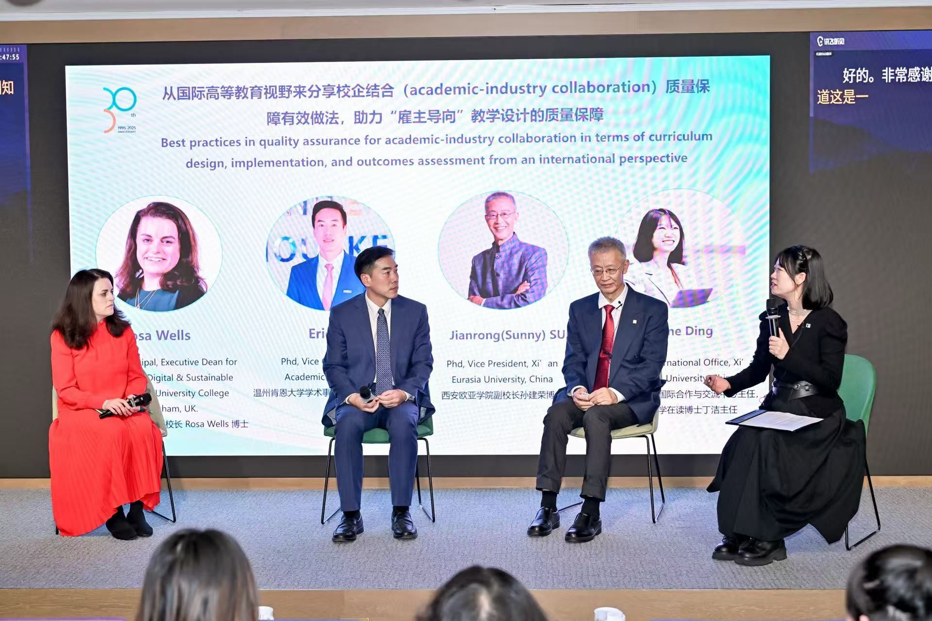 校庆当日,教学质量评估中心、国际合作与交流中心与国际语言中心在春山里木礼堂联合举办“企业导向与人才培养——高等教育国际化视野中的质量保障”圆桌论坛。论坛邀请英国伯明翰大学学院副校长罗莎・韦尔斯、温州肯恩大学副校长杨毅欣、西安欧亚学院副校长孙建荣参与分享,围绕英、美高校课程设计与社会需求对接、教育质量保障路径及微专业认证标准等议题展开交流,为我校人才培养模式创新与质量保障体系建设提供了国际经验与实践思路。