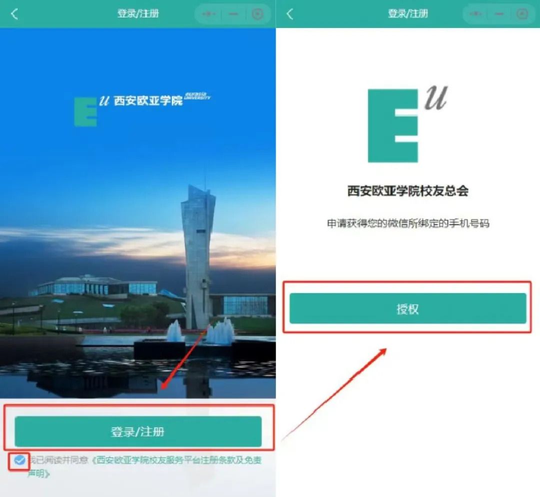 4.【登录/注册】、【授权】点击授权手机号,确认获取微信绑定的手机号码。