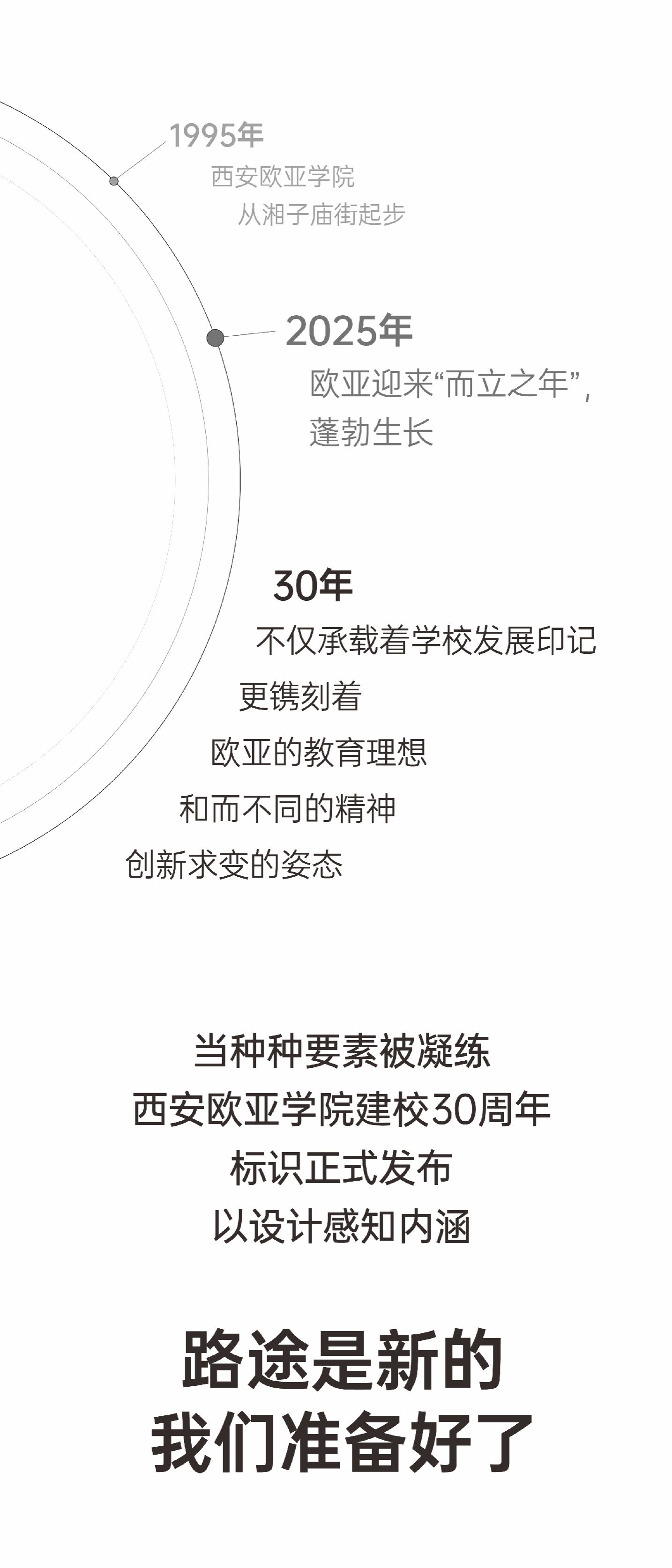 西安欧亚学院建校三十周年标识通过半圆环与圆环的组合,搭建出极简现代的“30”图形结构。